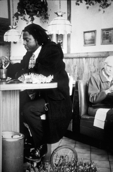 Included here are videos of Papo Colo dragging 51 pieces of wood up the West Side Highway; Zhang Huan striding the streets of New York’s Upper East Side in 2002, shortly after the attacks on the World Trade Center, wearing a costume fashioned from raw meat; and Pope.L crawling the entire 22 miles of Broadway in a Superman suit with a skateboard strapped to his back. Jefferson Pinder’s video, Marathon, follows Pinder as he runs naked through a park in Baltimore, picks up and dons articles of clothing that have been left for him as he continues running through the city’s African-American neighborhoods (spoiler alert: he’s fully clothed in a suit and tie by the time he reaches the business district).